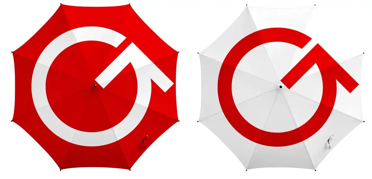 這個設計非常具有創意和獨特性。它以一個紅色的圓圈為背景,中間有一個向上的箭頭,與網絡中經常出現的 loading 圖標相似。此外,還可以看到一個「G」字和數字「70」。