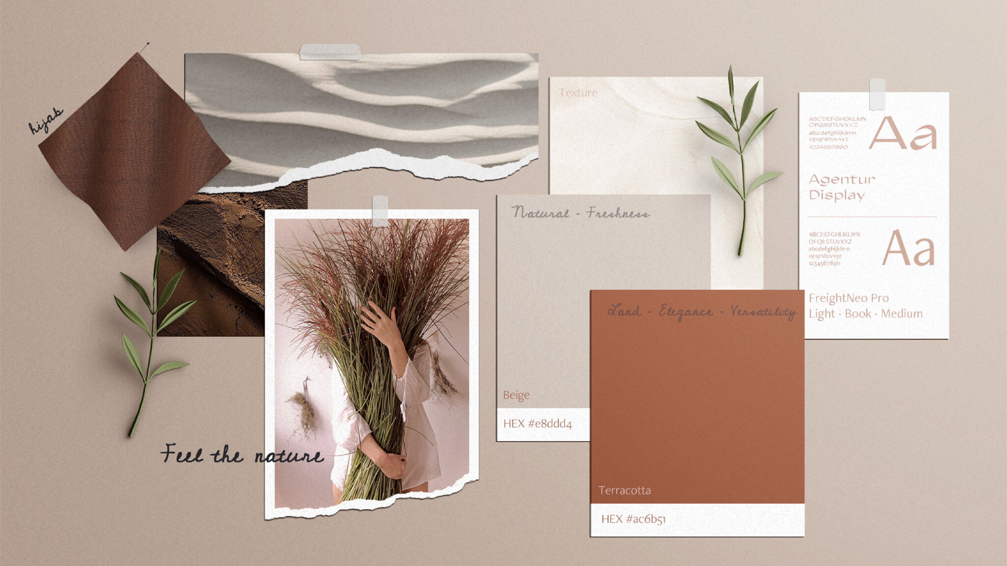 服裝行業品牌形象設計中標志設計的靈感來源于自然界中那些輕輕起伏的表面,指的是“多愁善感”的頭巾的運動和輕盈。概念感受自然:用高質量的可持續材料和做法生產,通過這些圍巾/頭巾的交流,提供一個感官的旅程,擁抱大自然的形狀和紋理的純凈。的概念--“感覺”這個詞也是用選定的紋理來表達的。地球,沙子,自然,更多地反映了這個項目的自然性,從而給它一個更加聳人聽聞的一面。