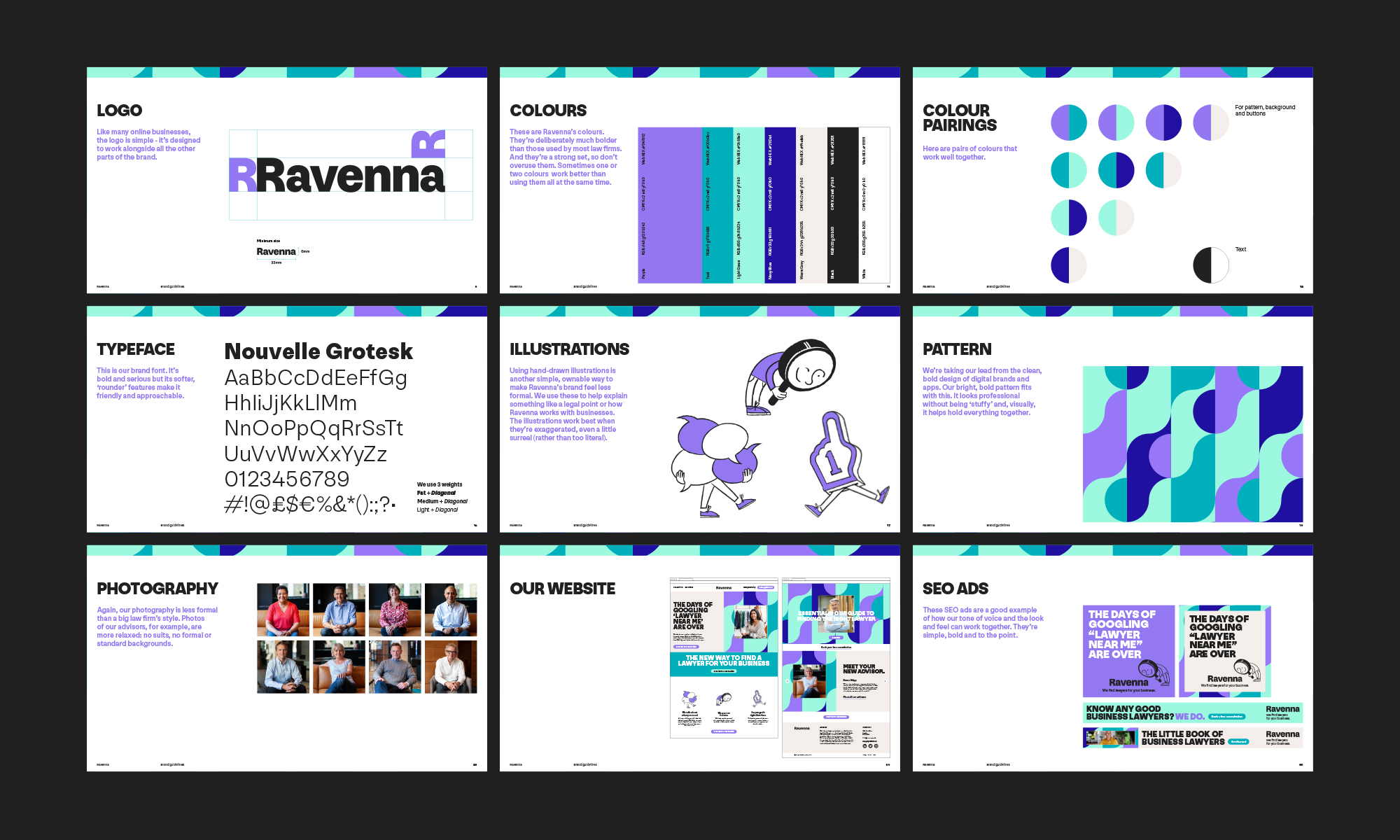 我們與超級語音專家 We All Need Words 合作,為 Ravenna 創建了一個大膽而引人入勝的視覺標識設計。這是一個為通常被認為是安全的世界創造新事物和有趣事物的機會。我們希望給 Ravenna品牌形象設計 一個既不同、獨特又多彩的外觀和感覺,以幫助將一家律師事務所帶入數字世界,并避免與該行業相關的任何常見的刻板印象。由于這是針對新成立的企業,它需要吸引新的和現代的觀眾,他們不怕與眾不同并探索新的途徑。