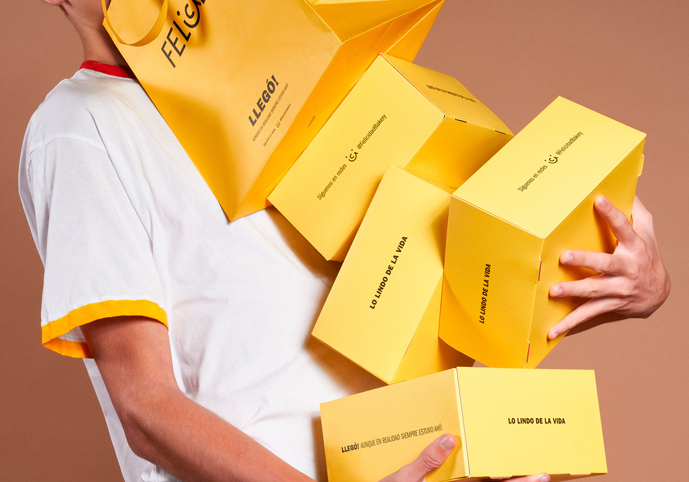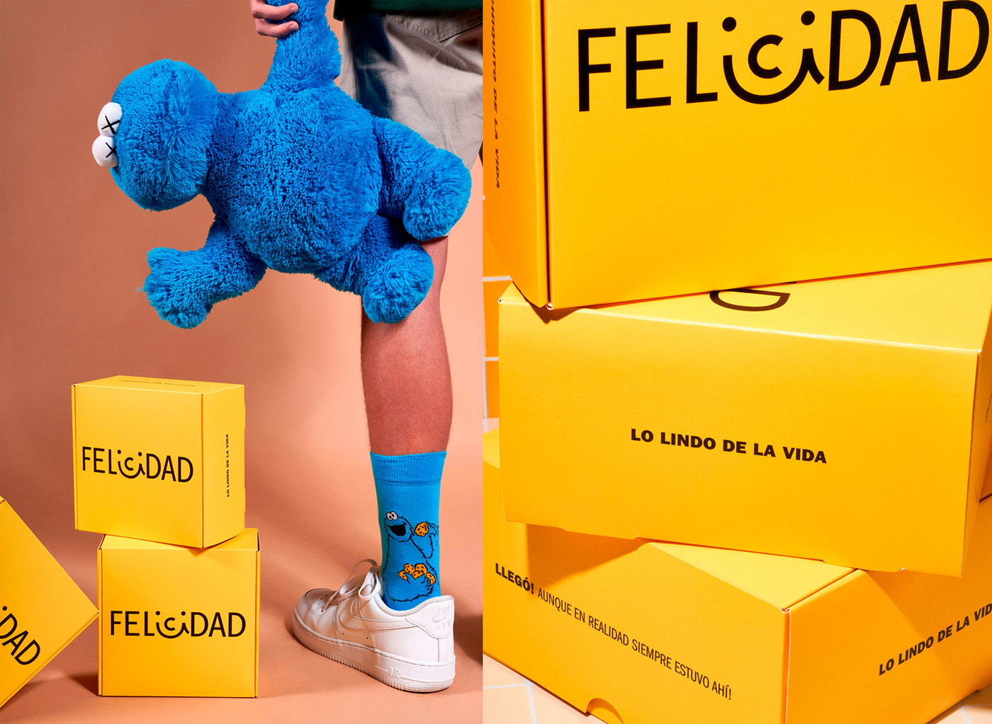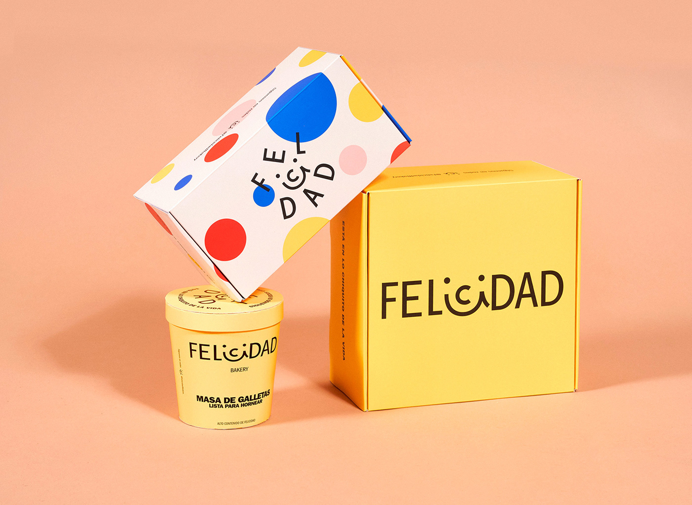 品牌設(shè)計中我們創(chuàng)建了 cookie 包的超級符號,其中包含一系列讓人們開心的事情。創(chuàng)作過程的秘訣結(jié)合了一點懷舊、大量的原色和一些童年記憶的烘焙。因此,F(xiàn)elicidad 的品牌標(biāo)識具有傳染性,就像幸福一樣。