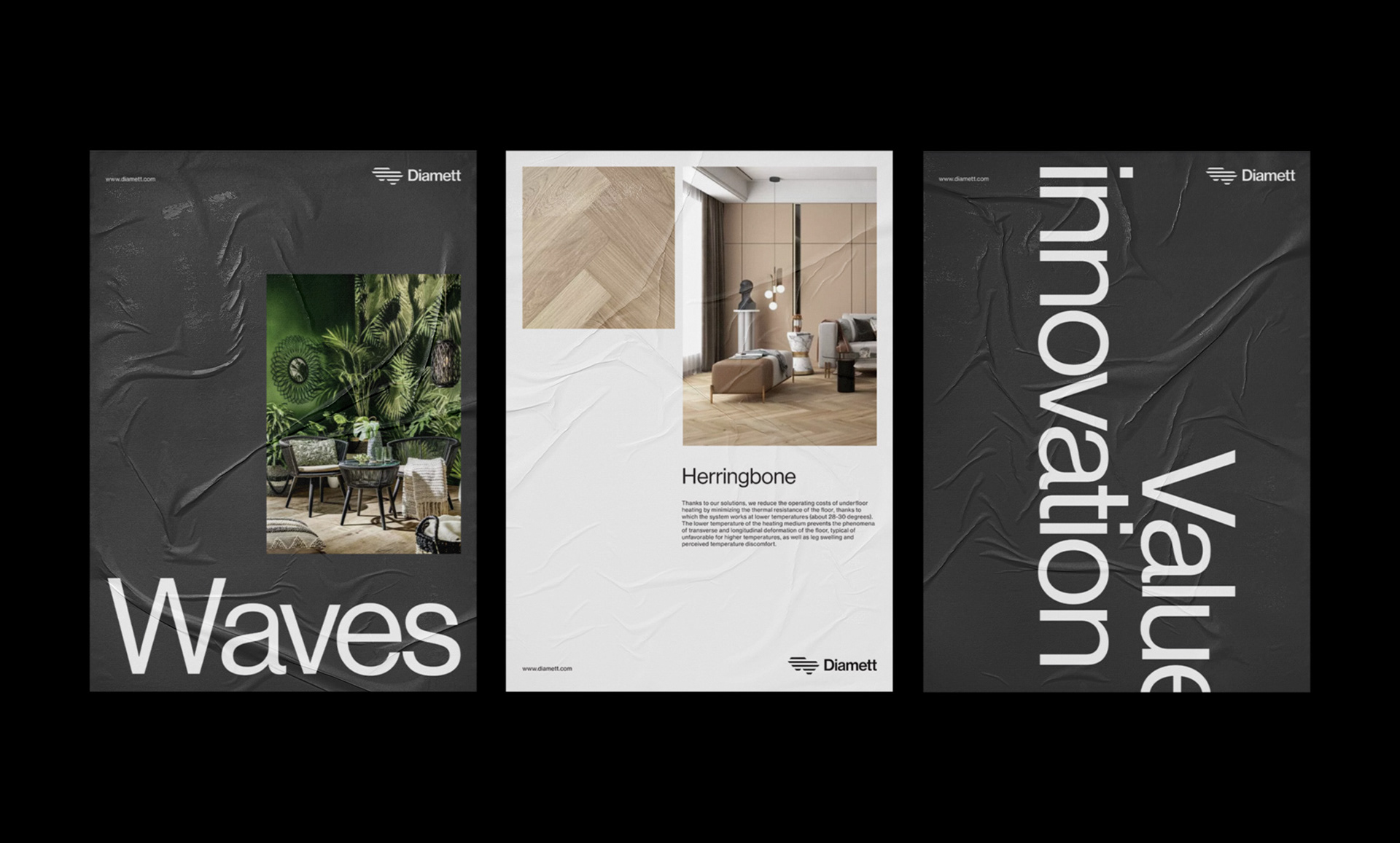 家居行業Diamett地板制造商品牌設計:Diamett是一家高端地板制造商,憑借其名為“瑞典板”的專利解決方案,擁有無與倫比的性能。七毫米厚的高密度HDF芯和八層清漆覆蓋在木材單板上,結果是地板可以承受任何虐待,在顏色和結構上都具有自然的光潔度。該技術還具有環保效益,僅使用1/6平方米實木地板所需的木材,使直徑地板成為可持續發展的選擇,而不會影響質量。一個額外的優勢是地板的導熱率比常規層壓板高63.5%,這使得地板下供暖更有效,更節能。