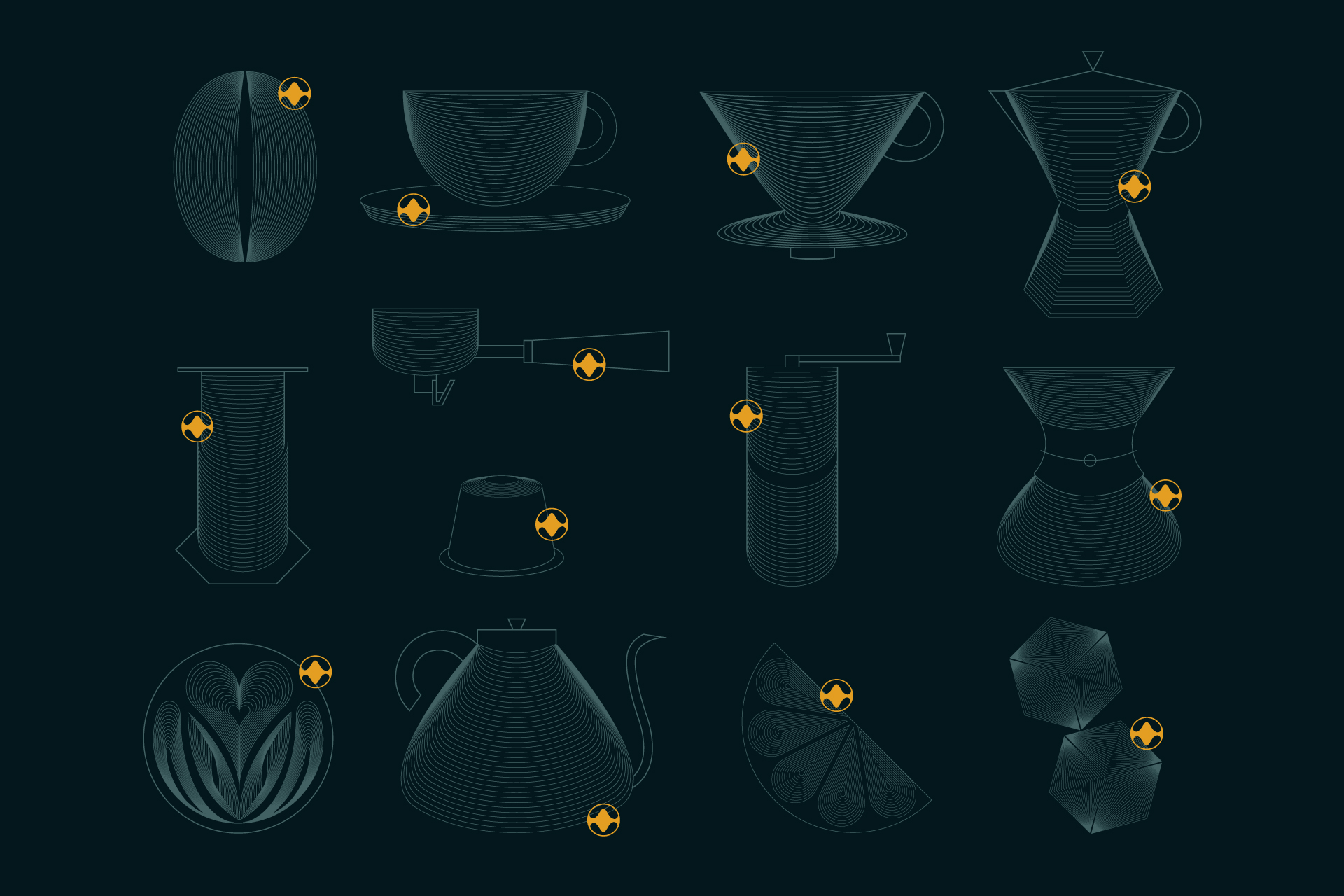 主要概念是基于咖啡品嘗過程中的味覺和嗅覺體驗(yàn)。這個(gè)旅程被描繪成一個(gè)波。它來來去去,沿著口腔以一種流動(dòng)的復(fù)雜性進(jìn)化,在整個(gè)品牌的圖標(biāo)和插圖中表現(xiàn)出來。使用的紋理是研磨咖啡的圖形表示,隨后是描繪咖啡豆中存在的許多芳香化合物的顏色變化。